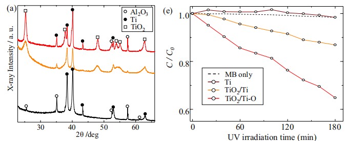 图2 (a) 利用机械涂覆法制备的TiO2/Ti复合光催化涂层的XRD图样及(b) 该涂层对有机染料MB的光催化降解