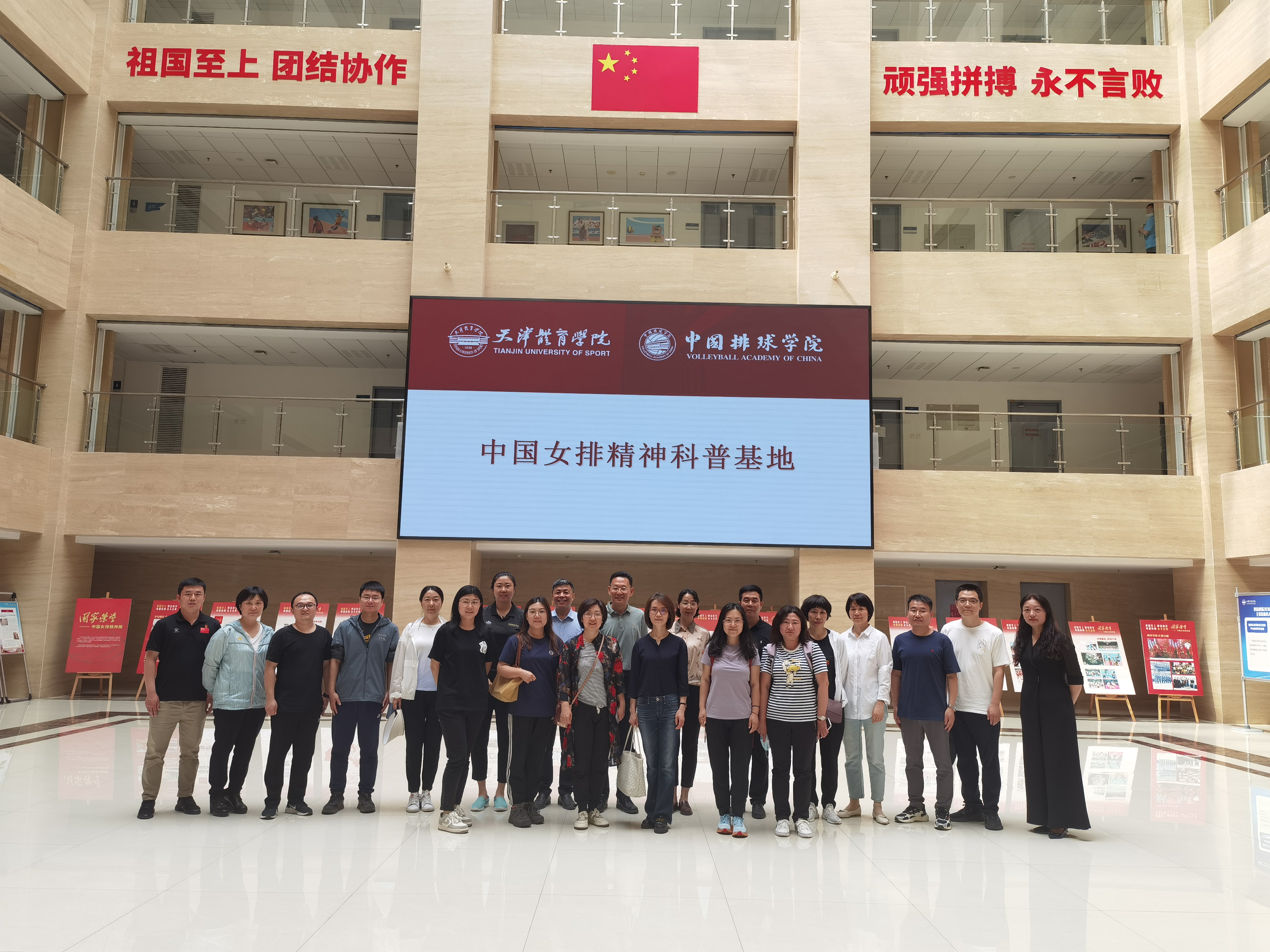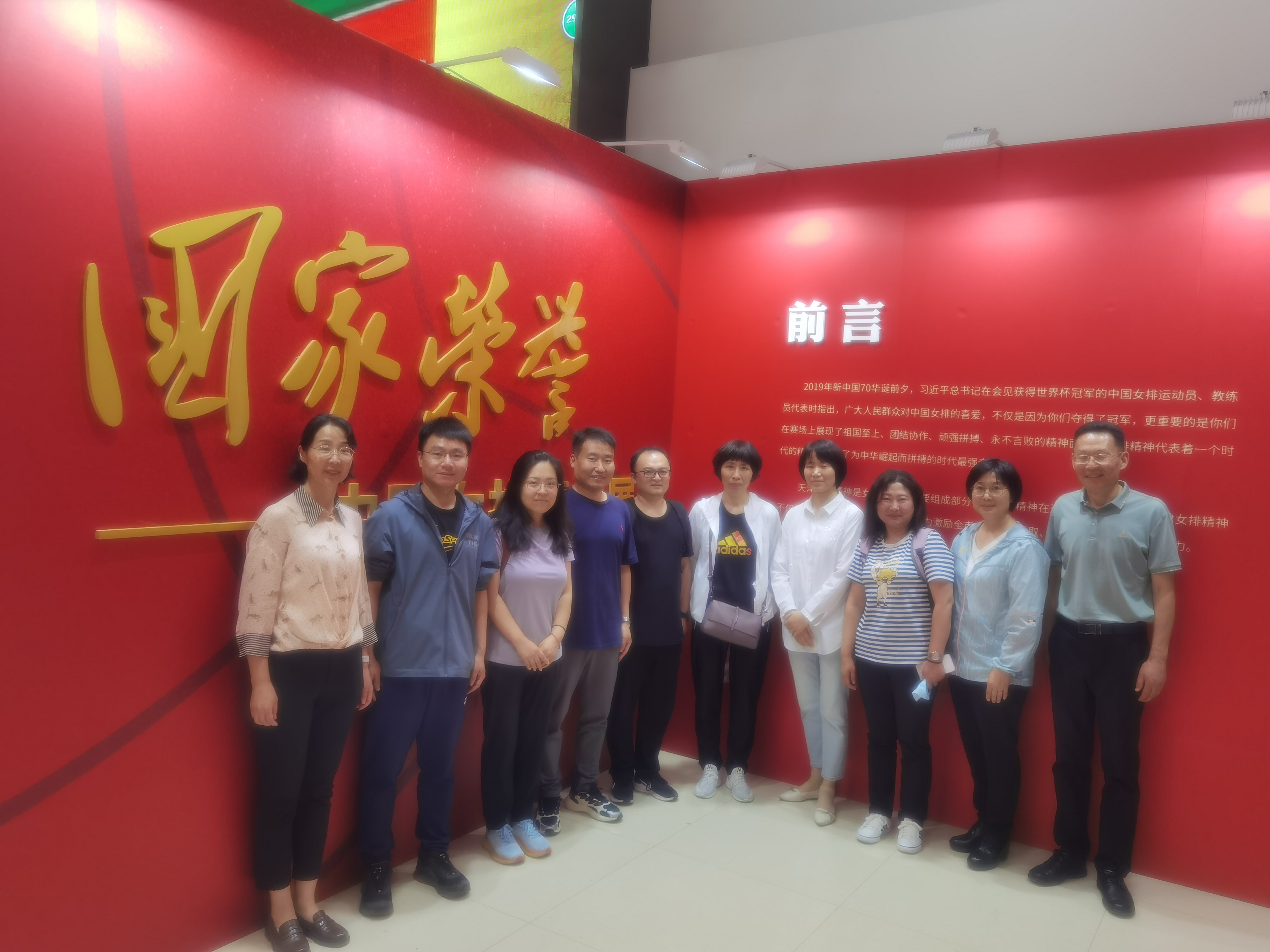 体育学院中国排球学院党委书记杨玉和常务副院长、排球世界冠军张娜热情欢迎科大学访组到来。学访成员一同参观了“国家荣誉——中国女排精神展”。杨玉引领大家回顾中国女排的奋斗历程,讲述排球队艰辛成长、队员为祖国而战、一次次勇夺奥运冠军、世界冠军的拼搏与辉煌,把“祖国至上、团结协作、顽强拼搏、永不言败”的女排精神诠释的淋漓尽致。学访成员静心聆听,凝神思考,感受伟大精神的洗礼。在一张张挥汗如雨的训练照片前驻足,在一件件沾满血迹的训练用品前观看,在一个个因奋斗而搏得的“雅号”前沉思,在耀眼的奖杯和金牌前凝视,深入感受中国女排精神之荡气回肠、催人奋进。