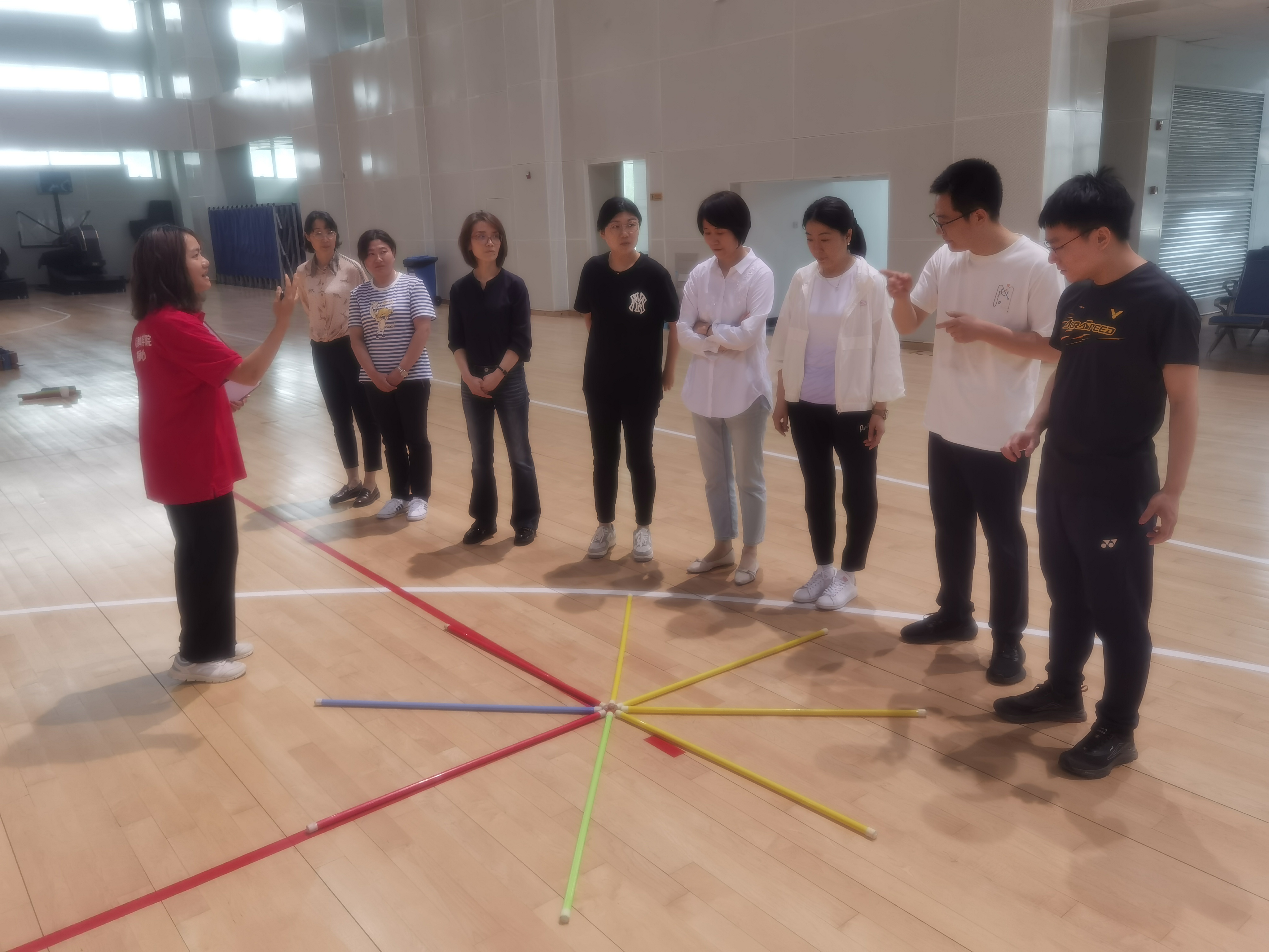在指导教师组织下,学访成员一字排开,精彩的团建活动次第展开。大家兴致高昂、全身心投入。按生日大小开展的“无声排队”考验彼此默契,“立杆行走”考验团队步调一致,“金球归洞”考验团结协作,“步步高升”考验整体协调。