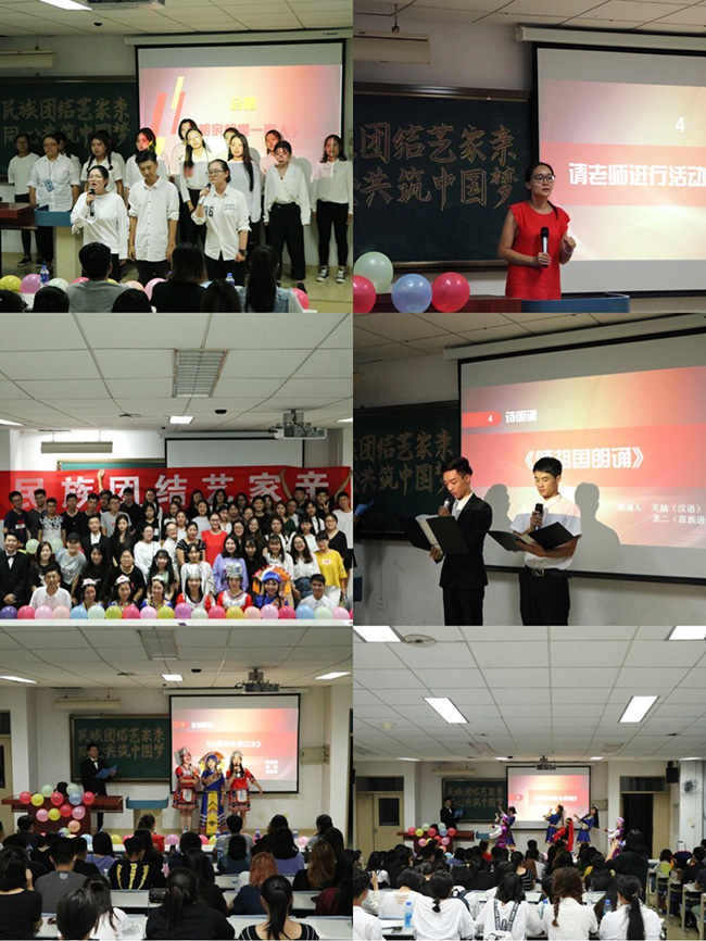 “民族团结艺家亲”联谊会于9月25日晚在5号楼213教室举行,此次联谊会面向学院全体各少数民族师生,联谊会开场展示了前期海报征集的高水平作品,紧接着壮族的黄子玲演唱壮族歌曲《山歌好比春江水》,少数民族学生表演的《新疆维吾尔群舞》,来自苗族的龙二同学用苗语朗诵《歌颂祖国》,各民族选出少数民族代表教授民族语言把活动带向高潮,院团委精心准备的各个民族的视频合集,让我们一起为民族团结进步事业点赞的呼声让在场同学热血沸腾。
