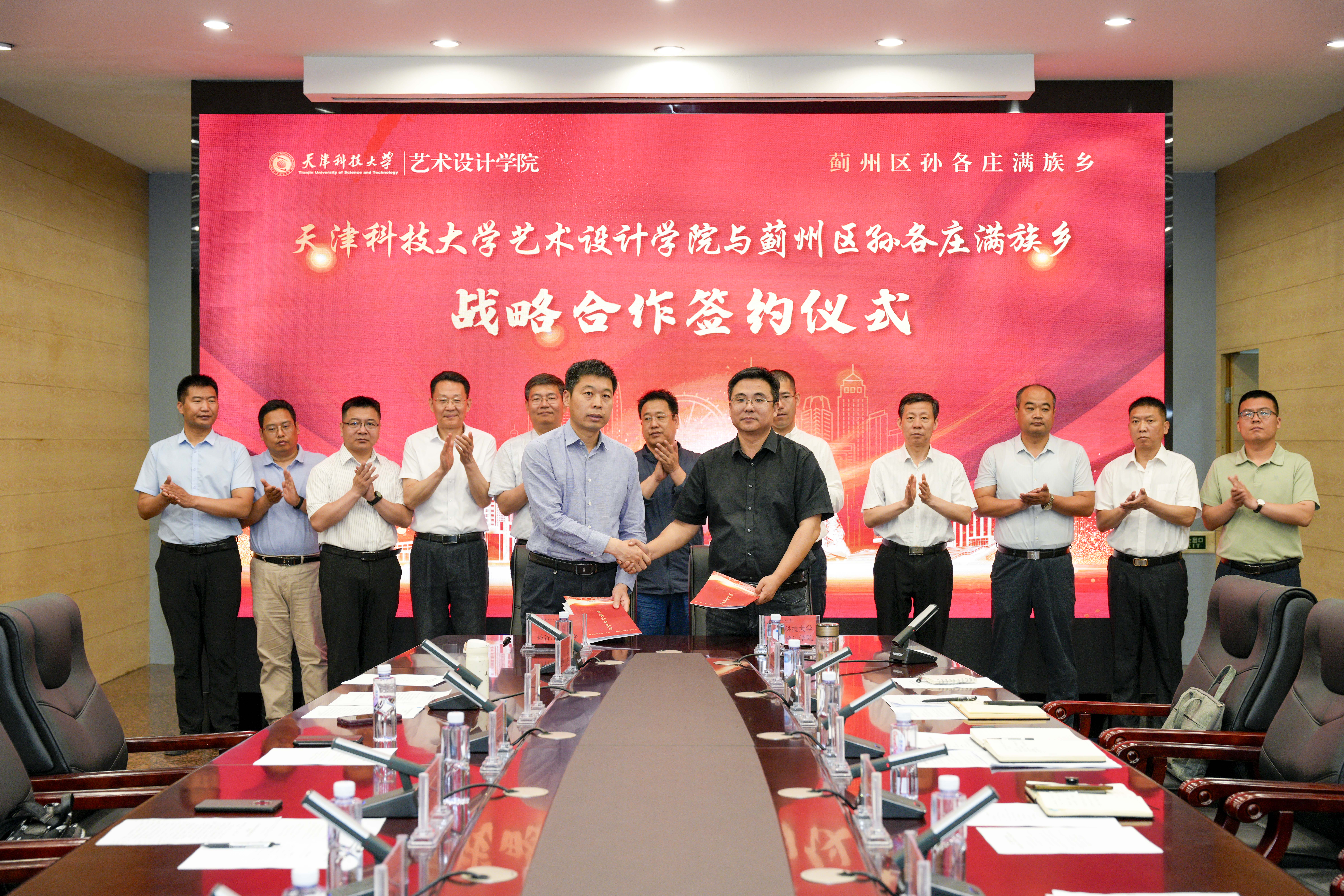 蓟州区委统战部分管日常工作的副部长周宏宇与天津欧美性爱免费党委常委、统战部部长郑运旺代表双方签订战略合作协议,蓟州区孙各庄满族乡党委副书记、乡长蔡伯与艺术设计学院院长张志宇代表双方签订战略合作协议。