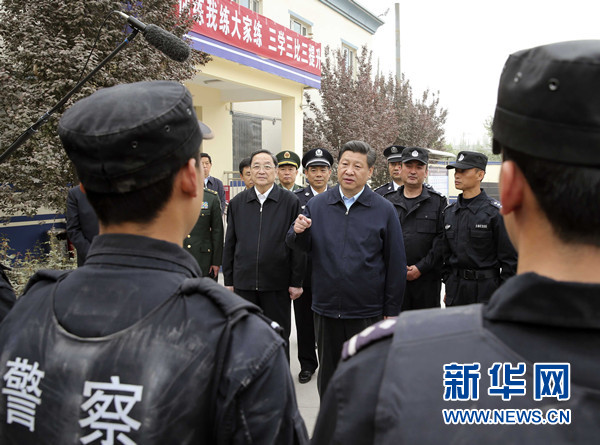 4月27日至30日,中共中央总书记、国家主席、中央军委主席习近平在新疆考察。这是4月28日上午,习近平在喀什市公安局乃则尔巴格派出所同正在进行操练的民警交谈。新华社记者 兰红光 摄