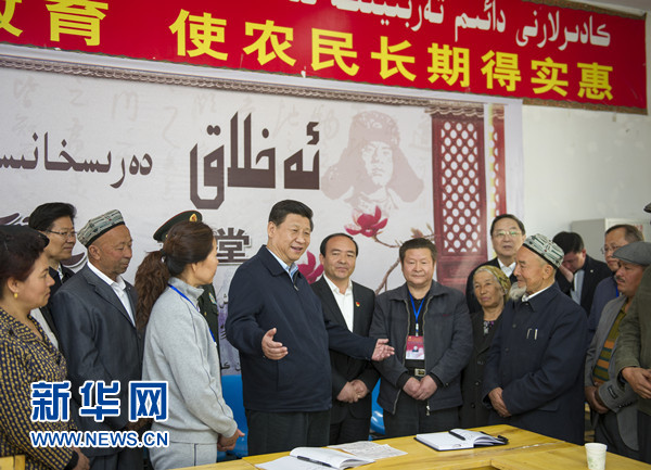 春天的新疆大地,万物复苏,生机盎然。4月27日至30日,习近平和中共中央政治局常委、全国政协主席俞正声,在中共中央政治局委员、新疆维吾尔自治区党委书记张春贤和自治区政府主席努尔·白克力陪同下,来到喀什和乌鲁木齐等地,深入乡村、企业、部队、学校、基层派出所、清真寺和新疆生产建设兵团,实地了解新疆经济社会发展情况,看望各族干部群众和部分长期在新疆工作的老同志,对做好新疆维护社会稳定、推进跨越式发展、保障和改善民生、促进民族团结、加强党的建设等工作进行指导。