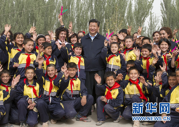 4月27日至30日,中共中央总书记、国家主席、中央军委主席习近平在新疆考察。这是4月28日上午,习近平在疏附县托克扎克镇中心小学同学生们合影。新华社记者 谢环驰 摄